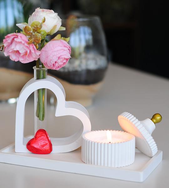 As a Valentine’s Day gift, this set is designed for romantic personalisation. The heart vase features a clear glass insert perfect for a delicate bouquet of pink ranunculus or a single red rose, while the ribbed bowl can be used as a lidded tea light holder to create a soft, flickering glow or as a safe place for cherished jewelry. With its elegant gold-tipped lid and matte white ceramic finish, this set is a timeless tribute to romance and mindful living.