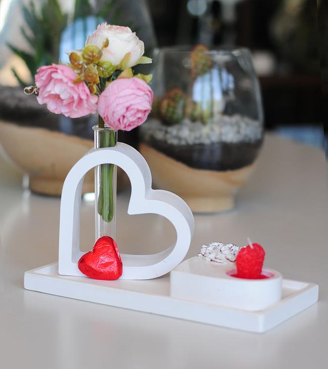 Components: 1x Sculptural Heart Vase (with glass insert), 1x Heart Tea Light Holder with integrated Aroma Stone, 1x Modern Rectangular Tray.