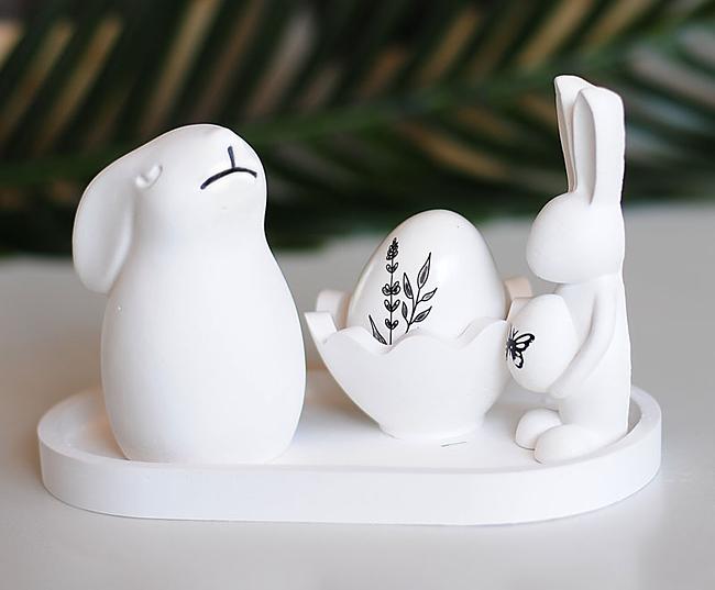 The scene is beautifully balanced on a minimalist oval tray and includes a scalloped "broken egg" holder nestled with a standalone illustrated botanical egg. Whether you use the eggshell to hold a tea light for a warm evening glow or fill the tray with the included colorful speckled mini eggs, this collection serves as a sophisticated yet playful focal point for your Easter celebrations. Hand-finished in a velvety matte white, it’s a timeless addition to any modern home.