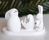 Set Includes: 1x Dreaming Bunny Figurine, 1x Butterfly Bunny Figurine, 1x Scalloped Broken Egg Holder, 1x Illustrated Botanical Egg, and 1x Oval Display Tray.