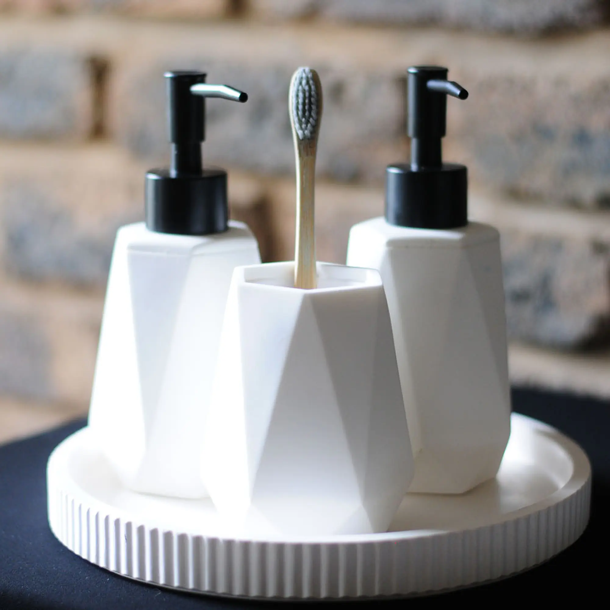 Elevate your daily ritual with the Prism Geometric Bathroom Suite. Hand-cast from premium gypsum resin, this four-piece set combines bold architectural lines with functional elegance. The centerpiece of the collection is a beautifully textured scalloped round tray that neatly organizes your essentials.