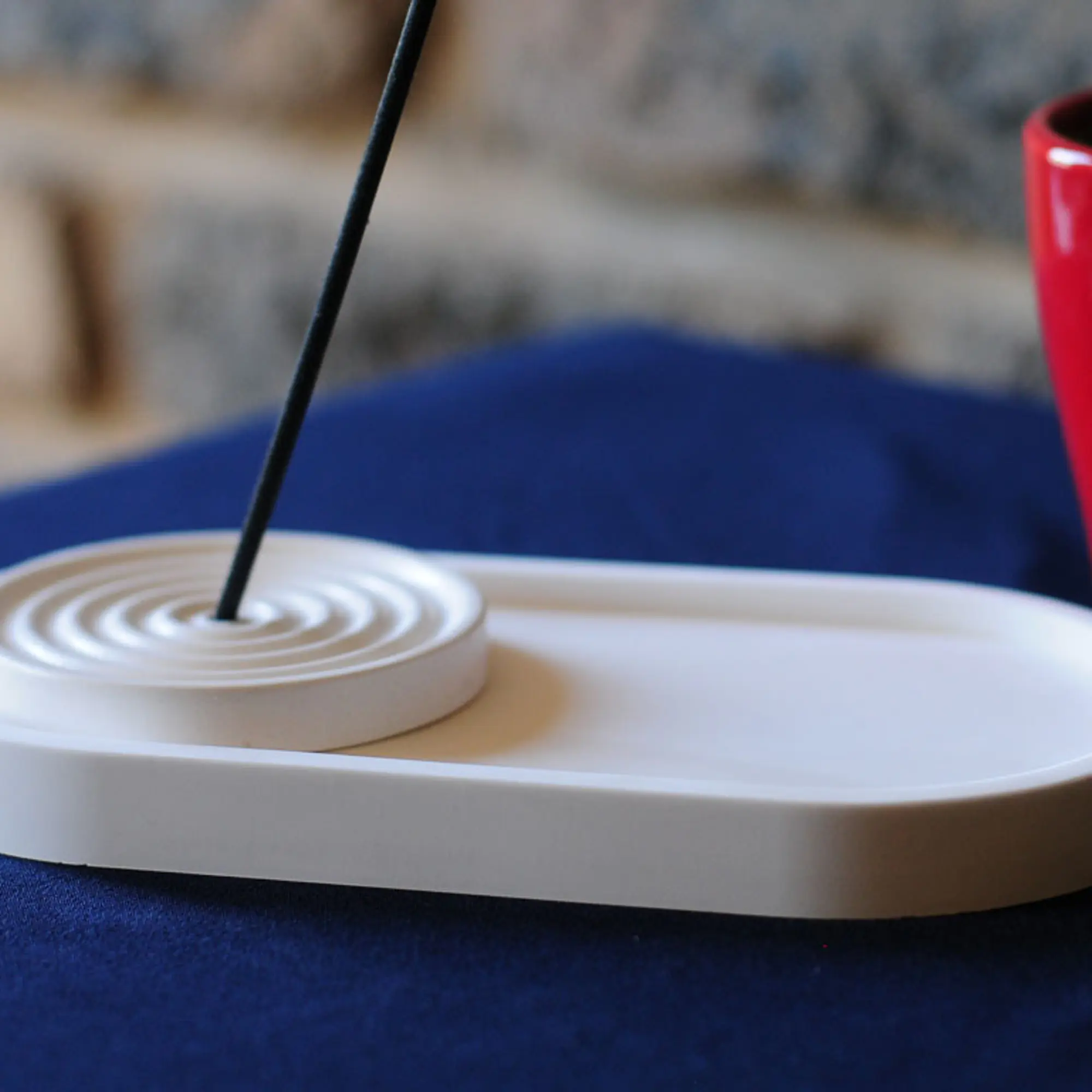 The set is anchored by a smooth, elongated oval gallery tray, which provides a protective foundation for your surfaces while catching falling ash. The matte white finish and architectural silhouette make it a perfect fit for a meditation corner, home office, or living room mantel. Designed for standard incense sticks, this set offers a minimalist way to enjoy your favorite fragrances while adding a sculptural element to your decor.